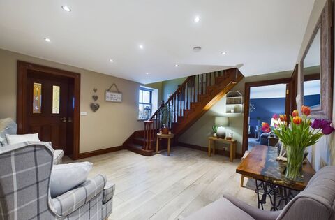 The striking entrance hall immediately impresses, featuring a grand staircase that sets the tone for the exquisite interiors.