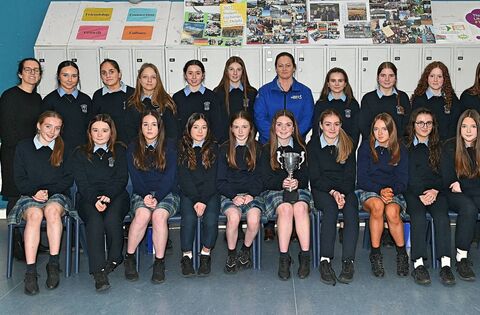 Uisce Éireann’s Patricia Lowry pictured with members of the St Brendan’s girls’ U-16 Galway county champions at Coláiste Mhuire, Ballygar. Patricia and school principal Emma O’Malley(also pictured) were part of the management team that guided the team to county title success. Pics. Gerard O’Loughlin