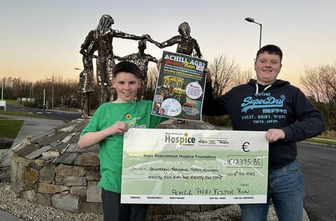 Two 14-year-olds have raised an astonishing €17,395.85 for Mayo Roscommon Hospice Foundation. They had hoped that their tractor run would raise €500 and they ended up raising 34 times that!