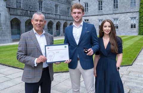 Sean Allen, a first year General Science student has been named as the recipient of the 2025 Séamus McDermott Entrepreneurial Scholarship. He is pictured here with Aidan Corless, chairperson, The Liffey Trust, and Dr Natalie Walsh, IdeasLab, University of Galway. Pic: Andrew Downes, Xposure