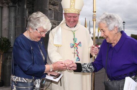 Bishop Dempsey greeting his aunts Margaret Butterly and Kathleen Lenehan back in 2020 as they admire his episcopal ring. Pic. John Mc Elroy