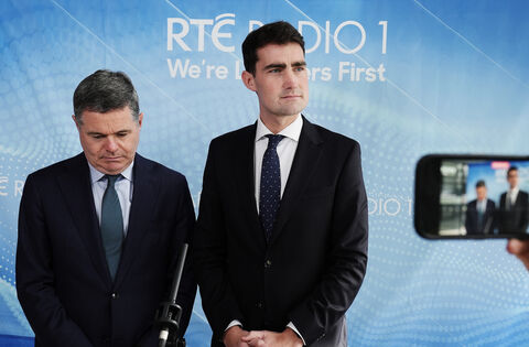 Minister for Finance Jack Chambers (right) and Minister for Public Expenditure Paschal Donohoe speak to members of the media after appearing on RTE's Claire Byrne show for the traditional post-Budget phone-in.