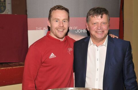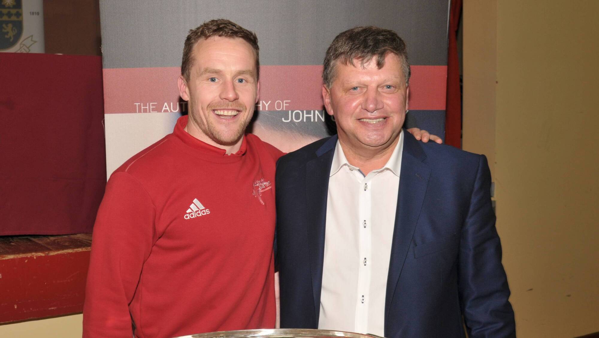 The late John O'Mahony pictured with Andy Moran at the launch of his memoir in St. Nathy's College. Pic. Liam Reynolds
