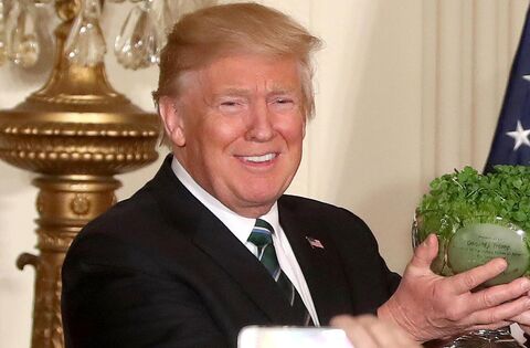 US President Donald Trump holds a bowl of Shamrock. Pic: Niall Carson/PA Wire