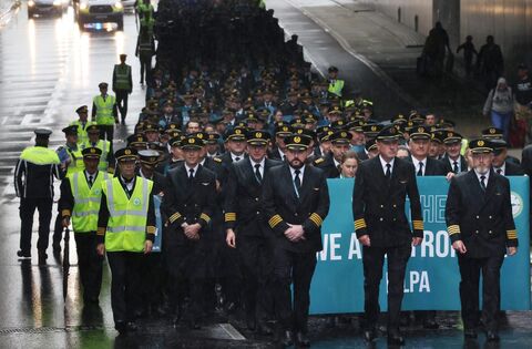 Aer Lingus pilots, members of the the Irish Air Line Pilots Association (IALPA), march towards the T2 Terminal at Dublin Airport on the first full 8 hour work stoppage in support of their claim for an increase in pay. Photo: Leah Farrell/© RollingNews.ie