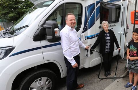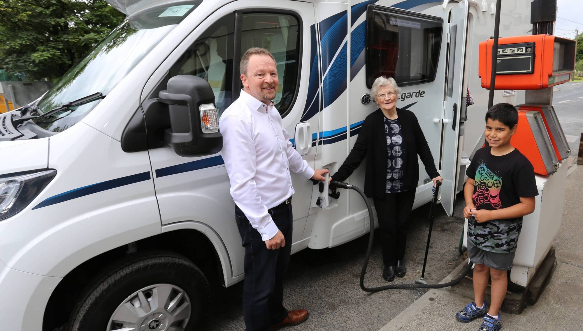 Margaret Creaton fills the camper van with diesel for Eddie Keane following the Eire Og fundraising draw back in 2021. Pic. Liam Reynolds