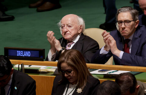 President Higgins along with Taoiseach Simon Harris during the opening session at the United Nations in New York . Pic Maxwells