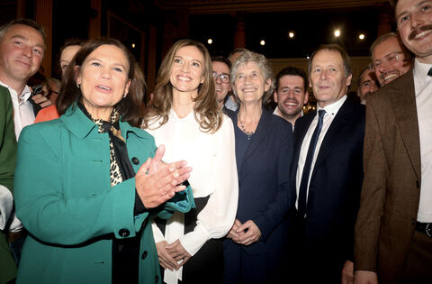 President Catherine Connolly with Sinn Fein and Social Democrats leaders Mary Lou McDonald and Hollie Cairns. Photo: Leah Farrell/© RollingNews.ie