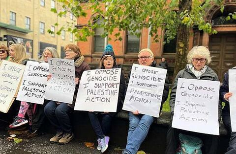 In Belfast, a crowd of about 60-80 activists and supporters gathered on a pedestrianised area close to the city’s main court buildings on Chichester Street at 1pm, with between 15-20 holding placards carrying the statement: “I oppose genocide, I support Palestine Action.”