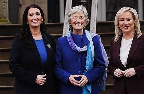 Deputy First Minister Emma Little-Pengelly, left to right, President of Ireland Catherine Connolly and First Minister Michelle O’Neill outside Stormont Castle, Belfast