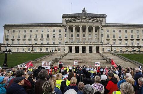 Representatives from Sinn Féin, the SDLP, UUP, and DUP were present at the demonstration, where calls of “we need the money” were heard.