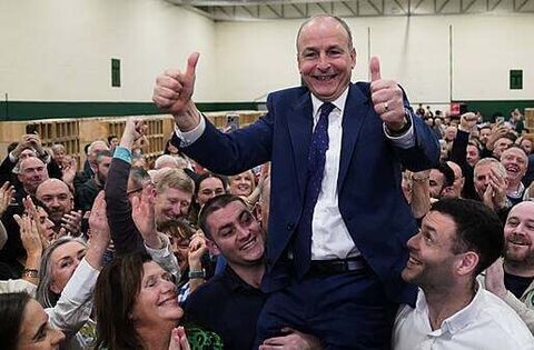 Fianna Fail leader Micheal Martin is hoisted up by his sons