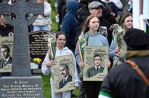 There was a colour party of people wearing face coverings, sunglasses and paramilitary-style dress, carrying the Irish flag and republican flags.