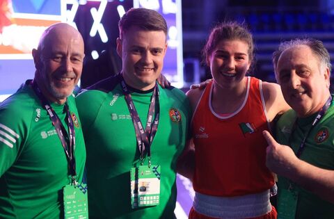 Aoife O'Rourke, pictured here with her coaching team, will box for a gold medal at the World Boxing Championships in Serbia on Sunday. Picture: INPHO/Aleksandar Djorovic
