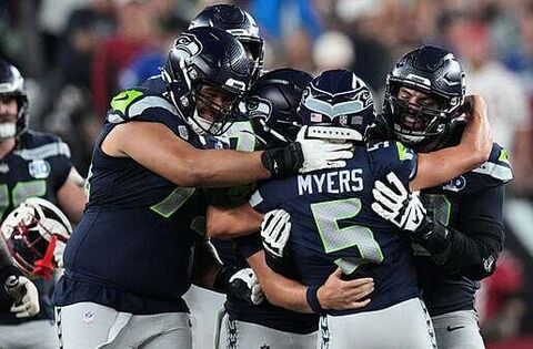 AJ Barner and Zach Charbonnet touchdowns in the first half had put the Seahawks in command – Sam Darnold throwing for 242 yards including Barner’s touchdown – and Myers made field goals at the start of the third and fourth quarters to open a 14-point lead.