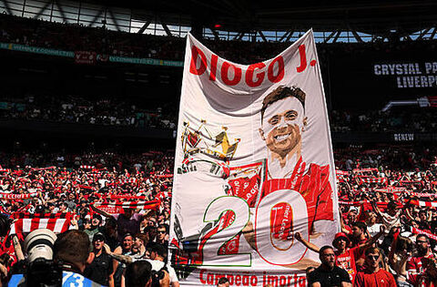 Liverpool fans earlier paid their respects with a rousing rendition of ‘You’ll Never Walk Alone’ as the wreaths were brought out, raising a white banner reading ‘Diogo J’ and featuring the forward’s image and number 20.