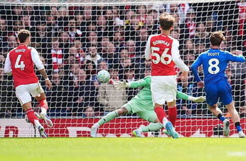 Ryan Christie was allowed the freedom of the Emirates to play an inch-perfect pass to an unmarked Adrien Truffert and the full-back’s slide-rule pass across the box pinged off William Saliba’s right boot, falling perfectly to Kroupi at the far post to cushion his volley home for his ninth goal of the season.