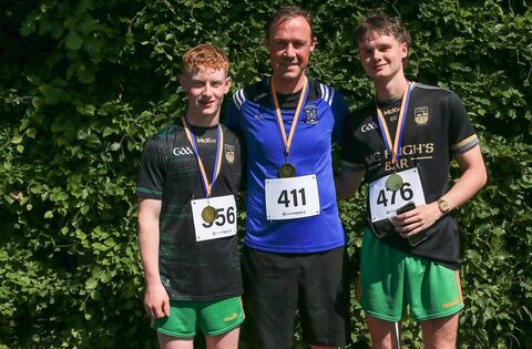 Male medal winners from the Chris O'Dowd 5k/10k Challenge in Lough Key Forest Park, Boyle, on Sunday last. L-r: Fiachra O'Dowd, 2nd; Brian Farrell, 1st, and Colm Corcoran, 3rd. Picture: Bernie O'Farrell