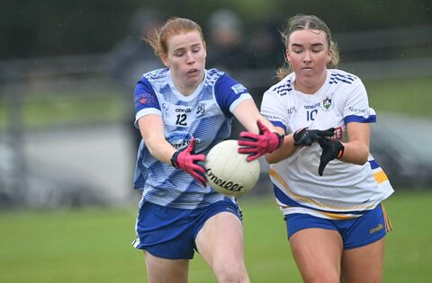 Aoife Gavin and Alanna McCormack challenge for possession during Sunday's senior ladies' football championship quarter-final between St. Dominic's and St. Ciaran's at Mulhern Park, Fuerty. Picture: Gerard O'Loughlin