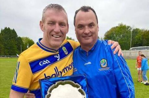 Roscommon Masters football manager, Anthony Carroll, with fellow Kilmore clubman, Dermot Foley, following their side's Plate success against Armagh in Kiltoom.