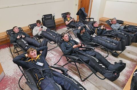 CHILL AND RECOVER: Strokestown players relaxing in their compression boots ahead of Sunday's intermediate football championship final against Elphin at Dr. Hyde Park. Picture: Gerard O'Loughlin