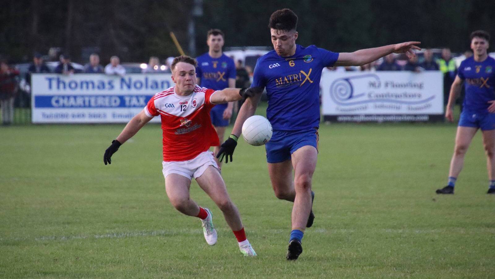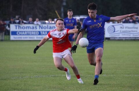 Clann na nGael centre-back Dylan Sumner launches an attack for his side under pressure from Pádraig Pearses forward, Jack Tumulty, during Friday evening's senior football championship game in Johnstown. Picture: Eugene Pettit