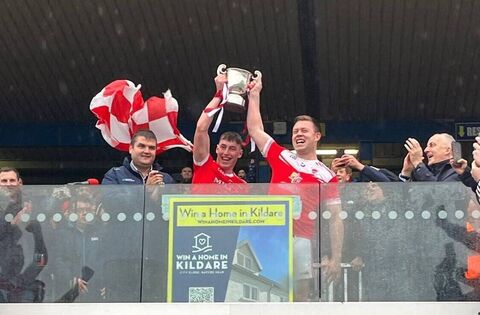 Caelim Keogh and Niall Daly lift the Fahey Cup to confirm Pádraig Peasrses as 2024 Roscommon senior football champions following their victory against Roscommon Gaels on Sunday afternoon.