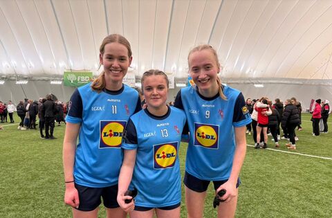 Kaitlin Egan, Shauna Walsh and Hazel Kelly celebrate the Convent of Mercy's historic provincial senior schools' football success against St. Attracta's at the University of Galway Connacht GAA Air Dome on Thursday.