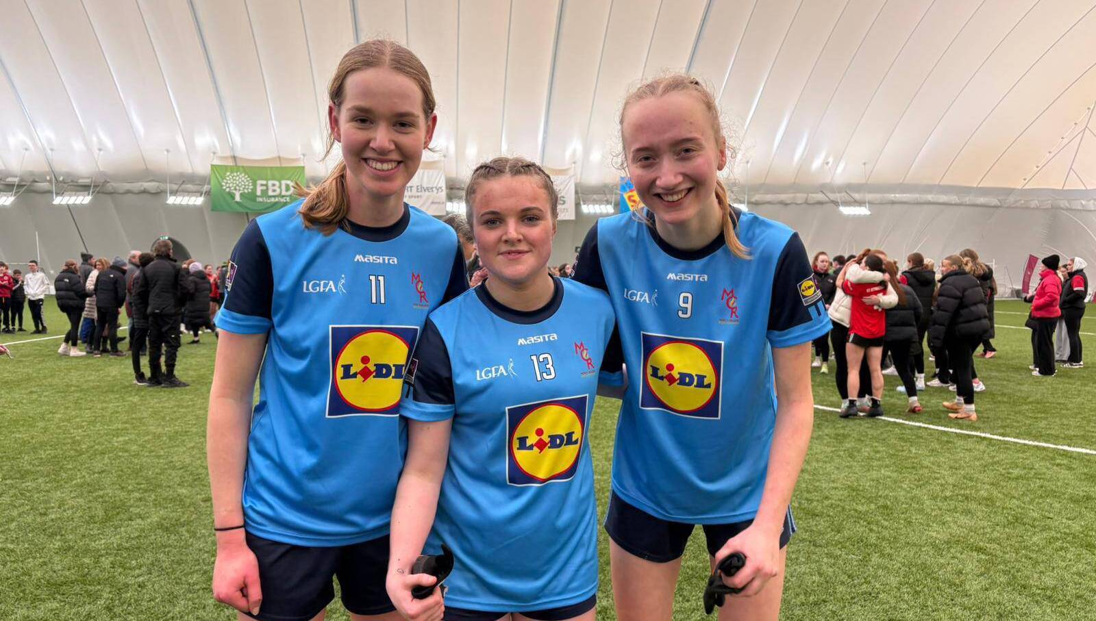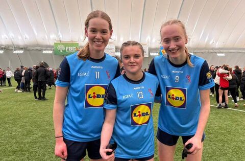 Kaitlin Egan, Shauna Walsh and Hazel Kelly celebrate Mercy College's historic provincial senior schools' football success against St. Attracta's at the University of Galway Connacht GAA Air Dome last month.