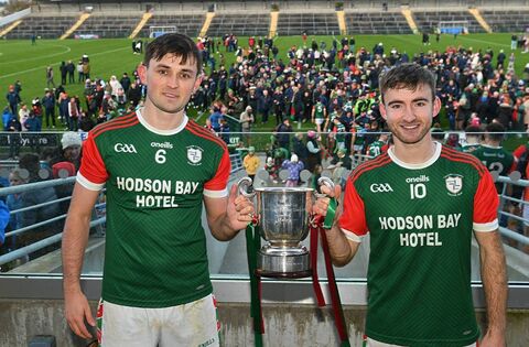 Brian Stack and Paul McGrath with the Fahey Cup after St. Brigid's beat Pádraig Pearses, after a replay, to be crowned 2025 Roscommon senior football champions. Picture: Gerard O'Loughlin
