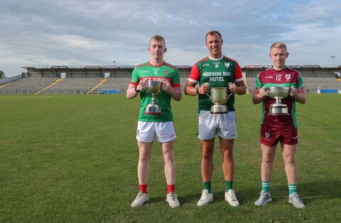 Winners of last season's adult football champions (l-r): Fiachra Henry, St. Michael's (Junior A); Cormac Sheehy, St. Brigid's (senior) and Donal Brennan, Castlerea St. Kevin's (intermediate), at the launch of this year's championships in Dr. Hyde Park. Picture: Courtesy of Roscommon GAA