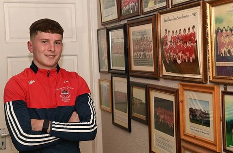 PROUD PAST: Declan Kenny beside pictures of successful Pádraig Pearses teams down through the years ahead of Sunday's county senior football final against St. Brigid's at King and Moffatt Dr. Hyde Park. Picture: Gerard O'Loughlin