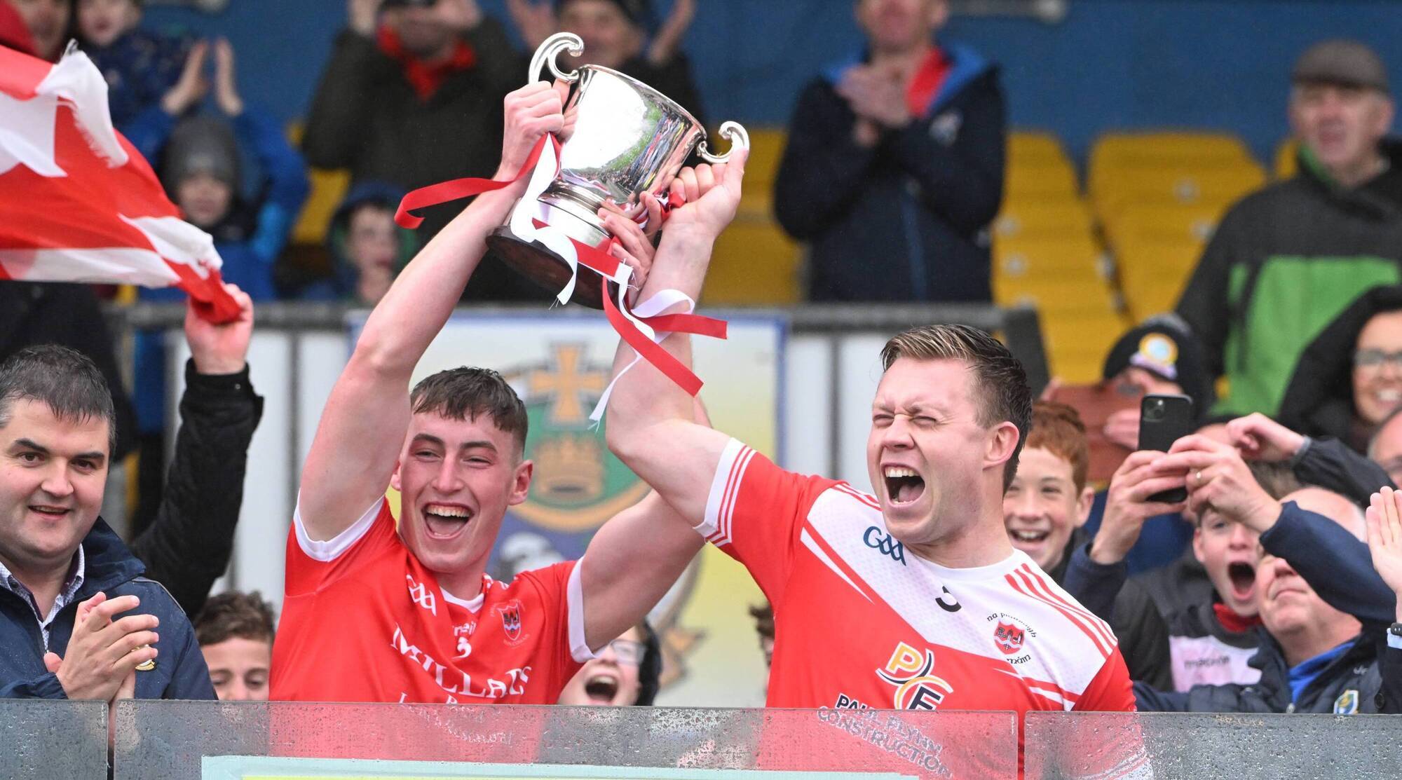Caelim Keogh and Niall Daly lift the Fahey Cup after Pádraig Pearses' victory against Roscommon Gaels in last year's county senior football final. Picture: INPHO