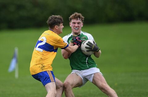 Fiachra Leavy (right) absorbs Cian Diffley's challenge during Sunday's Junior A football championship quarter-final between East Roscommon neighbours, Kilglass Gaels and St. Barry's, in Kilmore. Pictures: Gerard O'Loughlin