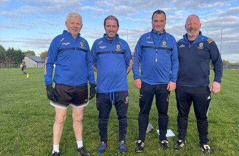 The Roscommon Masters football management of selectors Declan Woods, Liam Butler and Damien Garvey alongside manager Anthony Carroll (second from right) at training in Kilteevan ahead of next Saturday's All-Ireland final against Tyrone.