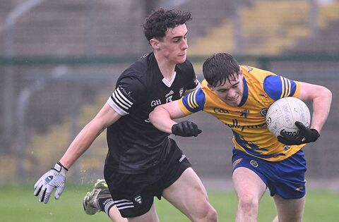 Roscommon corner-back Colin Murray tries to extract himself from Sligo forward Cathal Gilligan during Friday evening's Connacht minor football championship encounter at Dr. Hyde Park. Picture: Gerard O'Loughlin