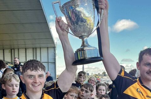 Joint captains Conor Coyle and Jack Donnelly lift the Mickey Cunniffe Cup to confirm Four Roads as Roscommon senior hurling champions for a 38th time at King and Moffatt Dr. Hyde Park on Sunday afternoon. Picture: Roscommon GAA