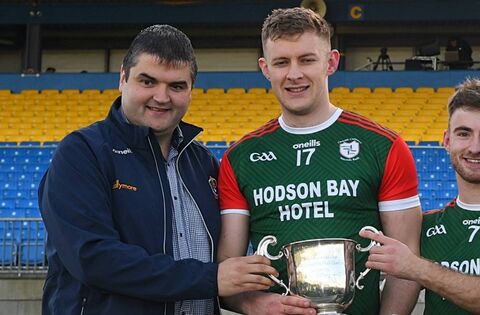 St. Brigid's joint captains, Mark Daly and Paul McGrath, receive the Fahey Cup from Roscommon GAA Chairperson, Brian Carroll, after winning last season's county senior football championship. Picture: Gerard O'Loughlin