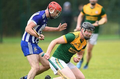 Oran's Thomas Fallon grabs possession ahead of St. Dominic's defender Jason Martin during Sunday afternoon's senior hurling championship semi-final at Ballyforan. Picture: Gerard O'Loughlin