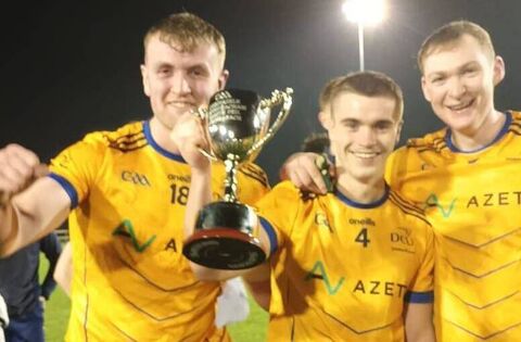 St. Michael’s player James Harte celebrated with his DCU team-mates last night after they won the Higher Education Intermediate League Final against Ulster University.