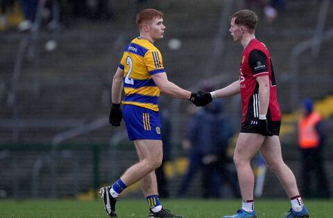 Colm Neary shaking hands with Down's Oisín Savage following Sunday's Division Two League game at King and Moffatt Dr. Hyde Park. Picture: INPHO/James Lawlor