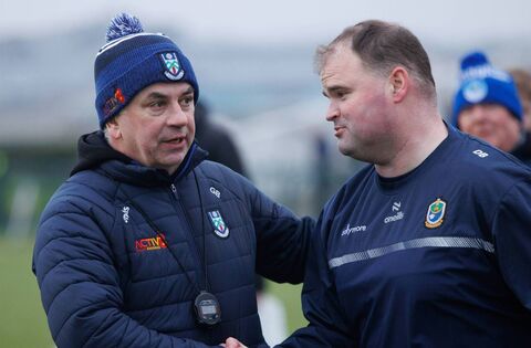 Monaghan manager Gabriel Bannigan congratulates his Roscommon counterpart, Davy Burke, following Sunday's Division Two League game at King and Moffatt Dr. Hyde Park. Picture: INPHO/Tom Maher
