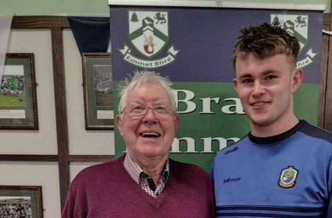 Finn Killion, with his grandfather John Torpey, hit 0-9 to help Roscommon Gaels reach this year's senior hurling championship quarter-finals.