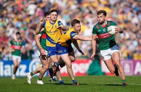Niall Daly and Brian Stack try to halt Aidan O'Shea's gallop during the Connacht senior football semi-final in Dr. Hyde Park on Sunday week last. Picture: INPHO/James Lawlor