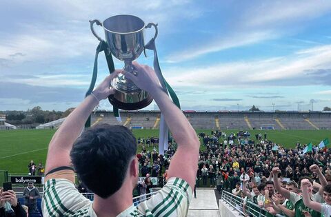 St. Barry's Eoghan Diffley lifts the Junior A Cup to confirm the East Roscommon club as champions for the first time since 2007 following their victory against Clann na nGael at Dr. Hyde Park. Picture: Courtesy of Roscommon GAA