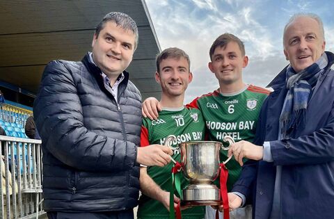St. Brigid's joint captains, Paul McGrath and Brian Stack, receive the Fahey Cup from Brian Carroll, Roscommon GAA Chairperson, and Tim Hayes, Hodson Bay Hotel Group, Roscommon SFC sponsor. Picture: Roscommon GAA