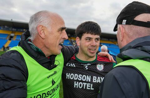 LEAVE IT THERE: St. Brigid's senior football manager, Anthony Cunningham, congratulates defender Seán Trundle following their side's victory against Ballina Stephenites at King and Moffatt Dr. Hyde Park on Sunday last. Picture: INPHO/James Lawlor