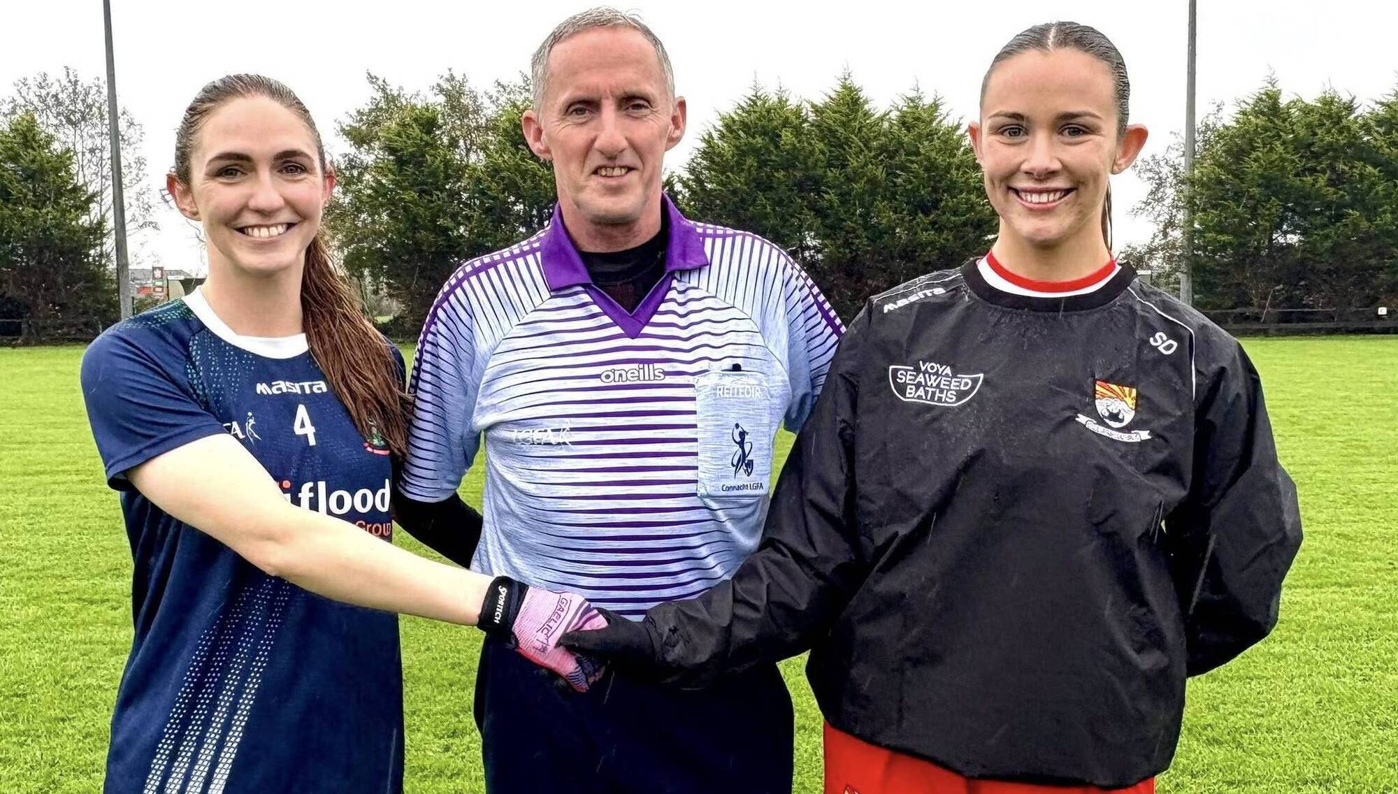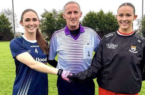 St. Barry's captain Niamh Toolan and Coolera/Strandhill captain Shona Dalton alongside referee John Devlin prior to throw in. Picture: Roscommon LGFA.