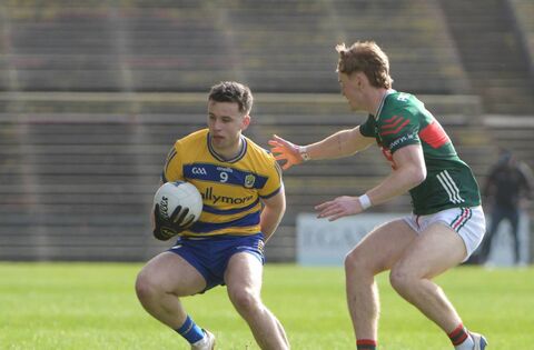 CHANGE OF DIRECTION: Roscommon midfielder, Conor Ryan, is forced to turn back by Mayo's Jack Carney during Sunday's Division One League game at Hastings Insurance MacHale Park, Castlebar. Picture: INPHO/Andrew Paton