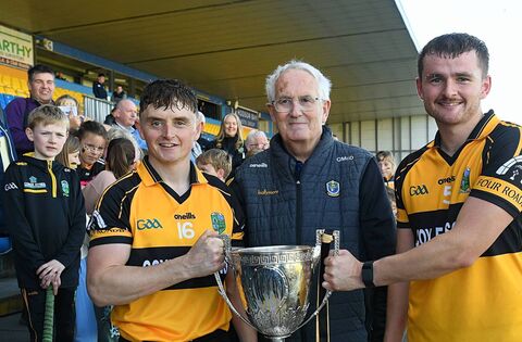 Four Roads joint captains, Conor Coyle and Jack Donnelly, accept the Mickey Cunniffe Cup from Roscommon Hurling Chairperson, Christy McDermott, following their side's victory against Oran at King and Moffatt Dr. Hyde Park on Sunday last. Pictures: Gerard O'Loughlin